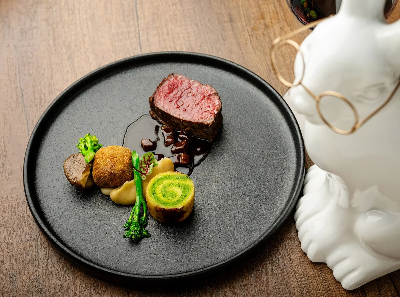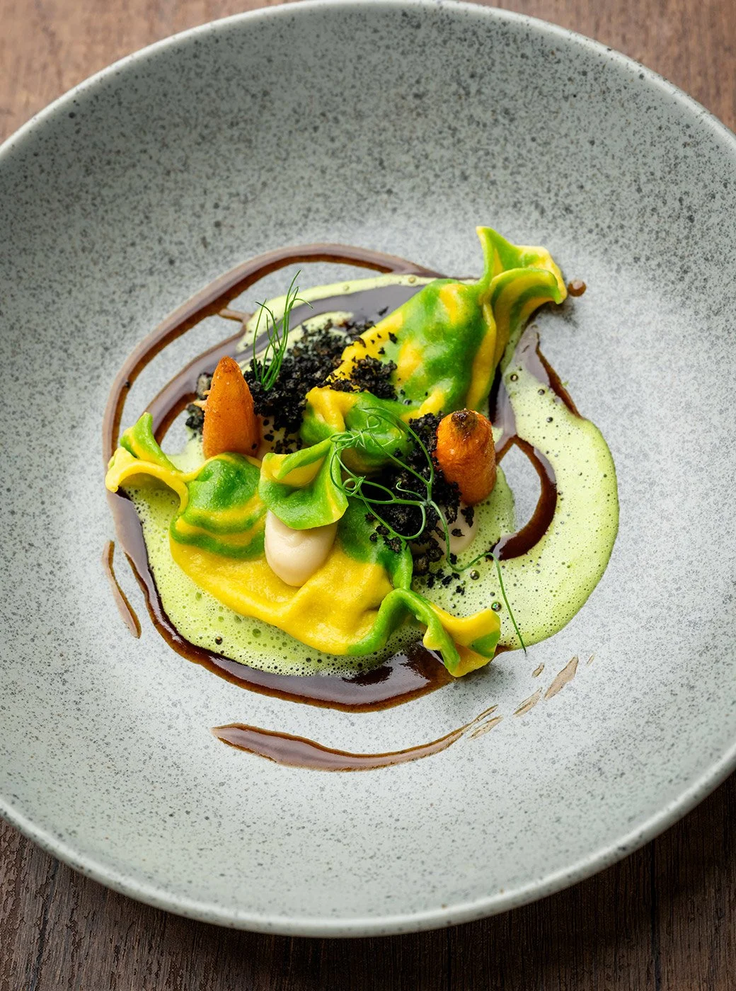 Next came two colourful caramelle pasta (candy-shaped stuffed pasta) filled with braised rabbit, bacon, and celeriac purée. The yellow and green-coloured pasta arrived on watercress foam with shiny jus drizzled around. A panko and charcoal crumble finished the dish, adding a satisfying crunch to each meaty, umami bite.