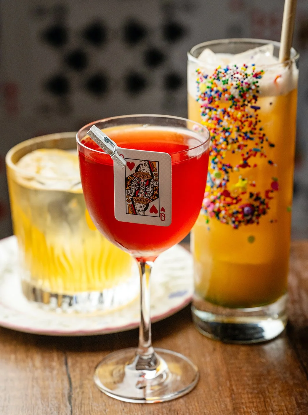 When we arrived at the table—walking past the bartender dressed as the Mad Hatter—the menu was inside a mysterious envelope on the table. A small stemmed glass adorned with a tiny queen of hearts playing card (stuck on with a mini clothespin) held the first cocktail of the night, “science,” which tasted like fruit punch with hints of peach and berry. It went down as smoothly as a fruit punch, too.