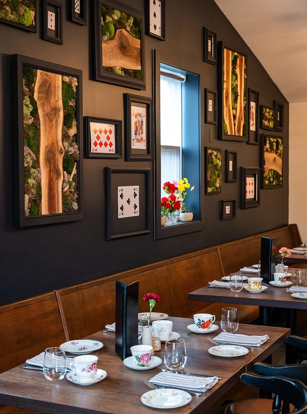 “I suppose I ought to eat or drink something or other; but the great question is, ‘What?’” Says the title character in Lewis Carroll’s classic children’s novel Alice in Wonderland from 1865. Such was not the case when I walked into Oxalis on April 4th for its 2024 spring-themed event. You could feel a “vibe,” as they say, entering the restaurant—or—Wonderland. Excited anticipation in the air from guests and the Oxalis team shaped the energy of the evening. Teapots galore, bird cages, ceramic rabbits, decorative mushrooms, checkered-patterned tapestries hung on the walls—the visuals didn’t hurt either. (Plus, all the staff were in costumes.)