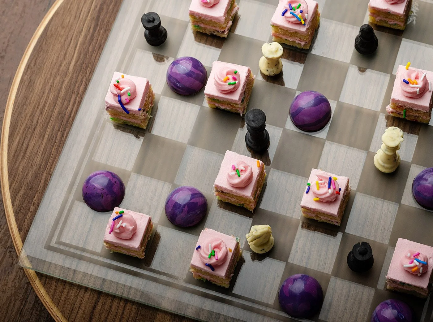Petit fours arrive on a glass checkerboard—chocolate chess figures, small square slices of “unbirthday cake,” and coffee-flavoured Cheshire Cat truffles—ended the dazzling meal. I’m not sure it could have been better.