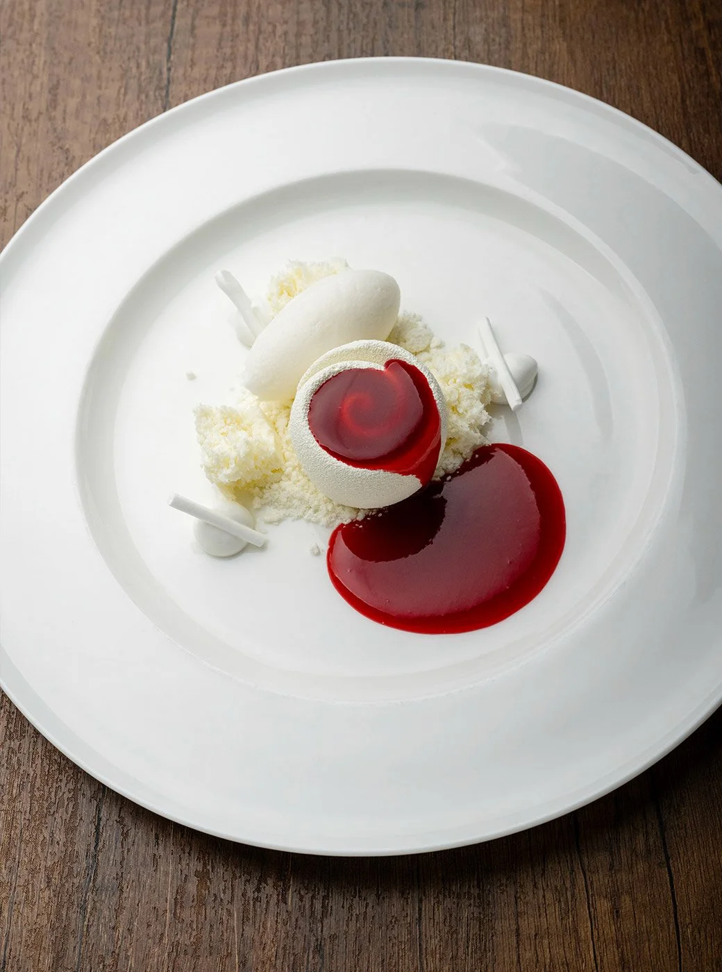 Dessert at Oxalis is always an art form; this night was no exception. Red Roses is a shockingly beautiful dish with all-white components topped by a vibrant raspberry sauce poured table-side. Sweet clover mousse shaped as a rose, yogurt sponge, sour honey sorbet, and white chocolate malto—all on a white plate—the blood-red raspberry sauce is then poured (from a white ceramic jug) into the rose until it bleeds over onto the plate. The intense raspberry sauce complements the tart sorbet and delicately sweet mousse perfectly. The dessert was both striking and delicious.