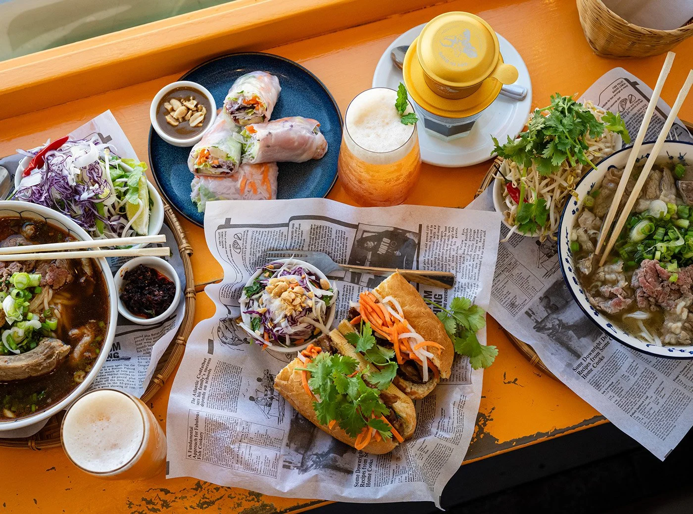 Banh Mi A&B offers a selection of banh mi, fresh spring rolls, soups, skillets, and specialty coffee drinks.