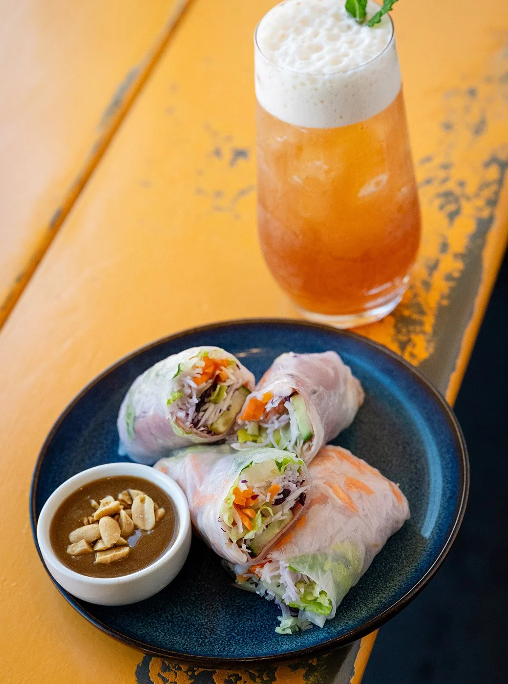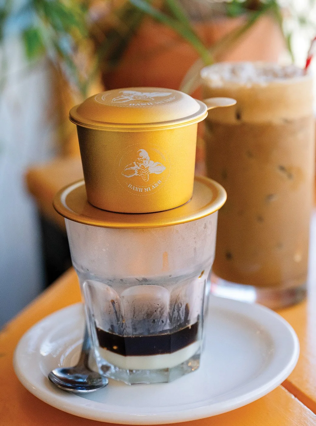 Vietnam is known for its coffee, which comes to the table in a contraption that filters coffee through a metal “phin” into sweetened condensed milk. It is also available as iced coffee, and Pham offers a few variations, including coconut coffee. In Vietnam, coconut coffee involves coffee layered into a coconut cream slush. Pham simplifies the process by shaking the coffee with coconut cream and ice (no slush), but it is still a deliciously satisfying iced coffee.