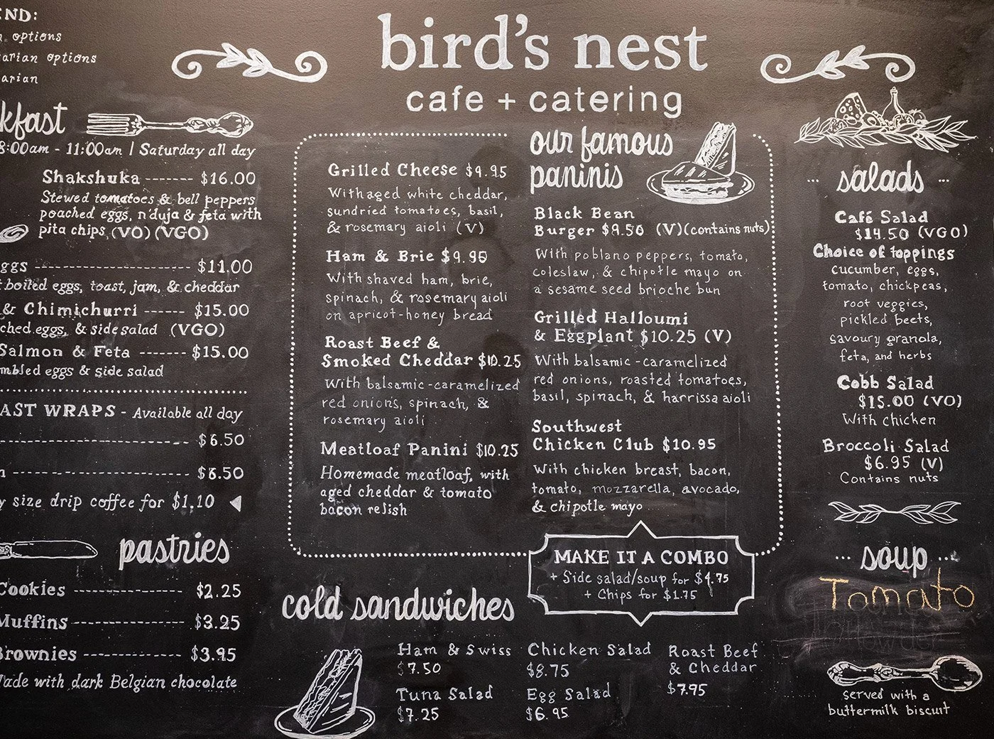 Muller created the menu for Bird's Nest using the 'greatest hits' from the Ciboulette days. The holdover included several paninis, like the Southwestern Chicken Club, made with chicken breast, bacon, tomato, mozzarella, avocado, and chipotle mayo. The bulk of the menu has remained the same, apart from a few seasonal add-ons.