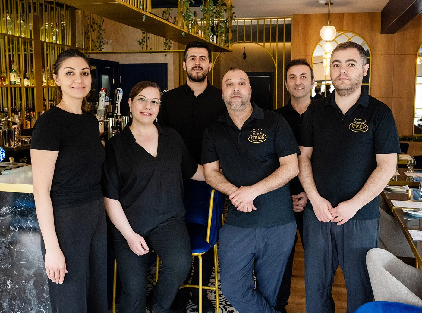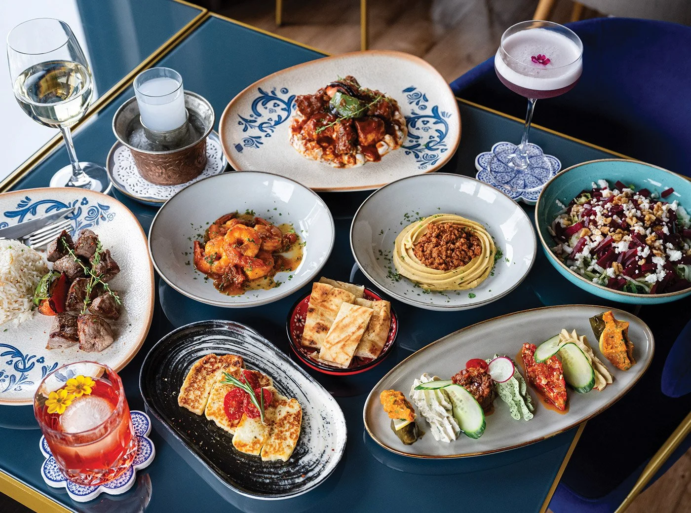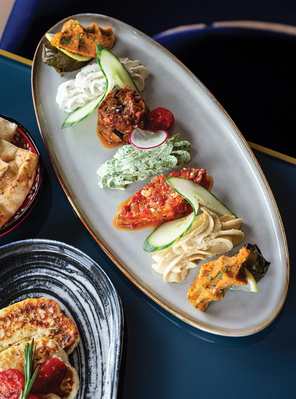 New digs meant a chance to create a new atmosphere, with pops of gold and rich royal blue.“We ordered from my designer in Turkey,” says Zeliha. “She did all the design, and then everything was custom-made. We brought it from Turkey, we shipped everything.” The plush blue banquette complements soft bar stools in the same hue. Slim golden bars with ivy woven throughout adorn the bar’s overhang, and two large arch-shaped mirrors on the back wall reflect light from the windows, opening up the space. Even the plateware has come from Turkey, in various colours and shapes—all beautiful.