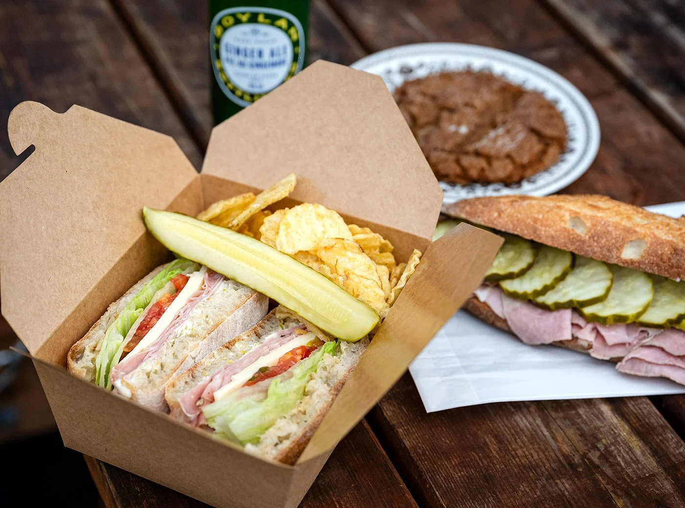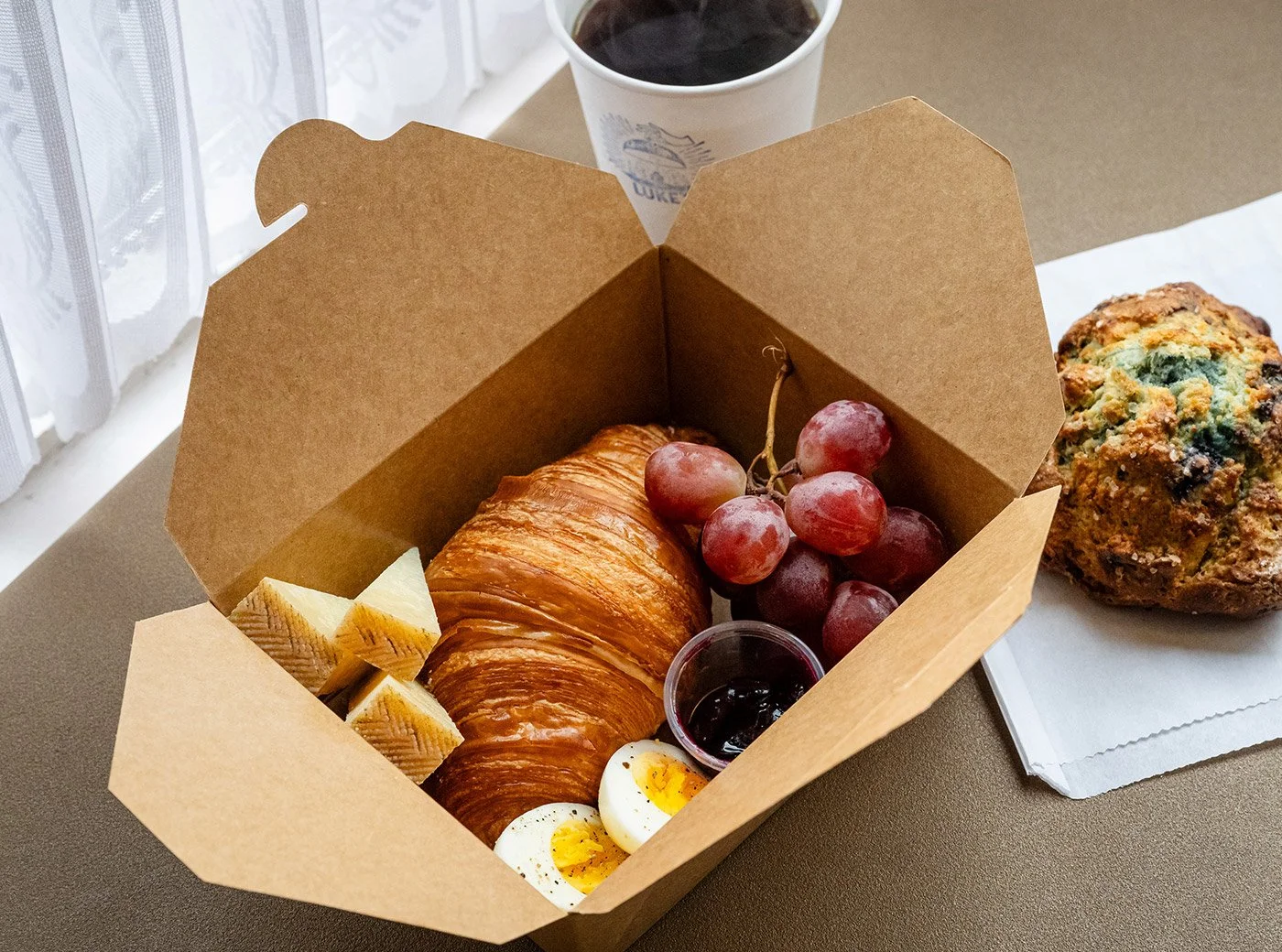 With excellent drip coffee in hand (Big Sipper Blend from Dartmouth-based roastery Have Fun Coffee), I try a breakfast sandwich freshly made behind the deli counter. Thinly sliced ham, egg patty, white cheddar, and local greens with house-made tomato relish on an English muffin—it’s the quintessential morning meal elevated with the sweet, tangy relish. I also dip into a breakfast box that features one beautifully flaky butter croissant, generously sized wedges of manchego cheese, grapes, and Luke’s blueberry jam. Add a taste (or two) of a blueberry scone and pain au chocolat, and I have a delightful breakfast spread. (Without room for an espresso machine, Luke’s only serves drip and iced coffee. But it’s also kind of a statement.)
