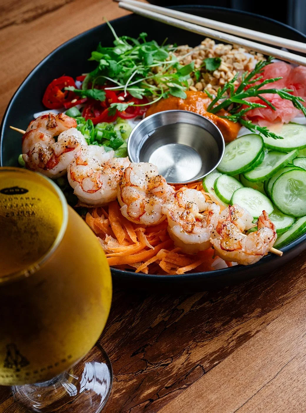 When I stop by on a hot summer day, I first try the cold noodle salad, which features rice noodles, cucumber, carrot, green onion, Thai chilli, cilantro, pickled ginger, a skewer of grilled shrimp, and plenty of crushed peanuts. Mirin (rice wine) and saamjang (a spicy Korean chilli paste) make for an acidic and fiery dressing that is balanced by the rich peanuts and cooled by the cucumber and noodles. Today, there is crunchy foraged sea asparagus in the salad. “I like to throw in my indigenous background as much as I can, as well as foraging—that’s a big part of what I do, and who I am, so I try to sneak it in once in a while,” says Levac. Foraged ingredients are seasonal and vary with the availability of local produce. Levac recalls foraging eight pounds of chanterelle mushrooms just the week before and using them for the restaurant’s taco Tuesday feature, which sold out that day.