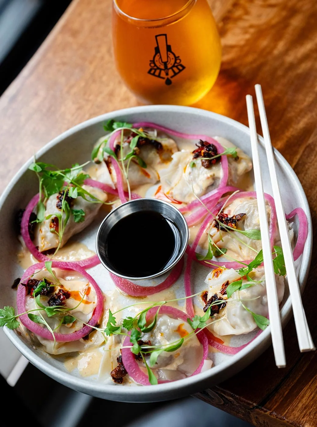 Levac also serves me his honey and harissa sausage dumplings. Filled with house-made sun-dried tomato and basil sausage, the dumplings—topped with chilli crisp oil, pickled red onion, and cilantro—sit atop a drizzle of honey-harissa yogurt. A traditional soy and rice vinegar dipping sauce sits in the middle. The sausage filling is rich and umami, complemented perfectly by the sweet, tangy yogurt, bright pickled onion, and crunchy, spicy chilli crisp. The perfect sharing plate is matched nicely with Maritime Express’s signature semi-sweet cider—The Dayliner—an award-winning, very food-friendly cider. “We like to think that everything on the menu pairs with The Dayliner,” says Levac.
